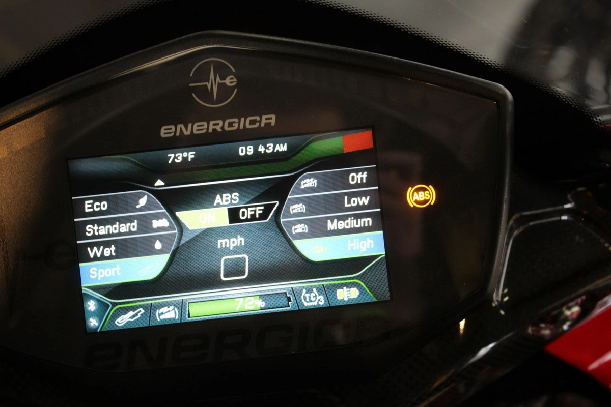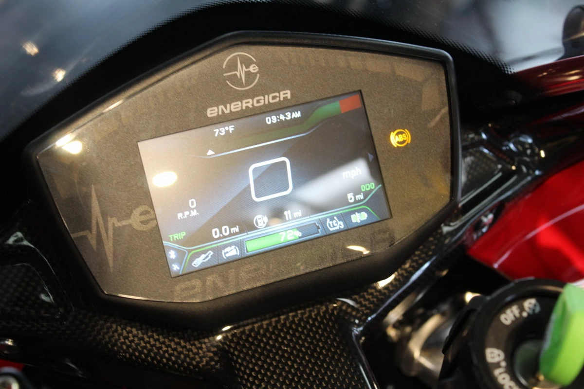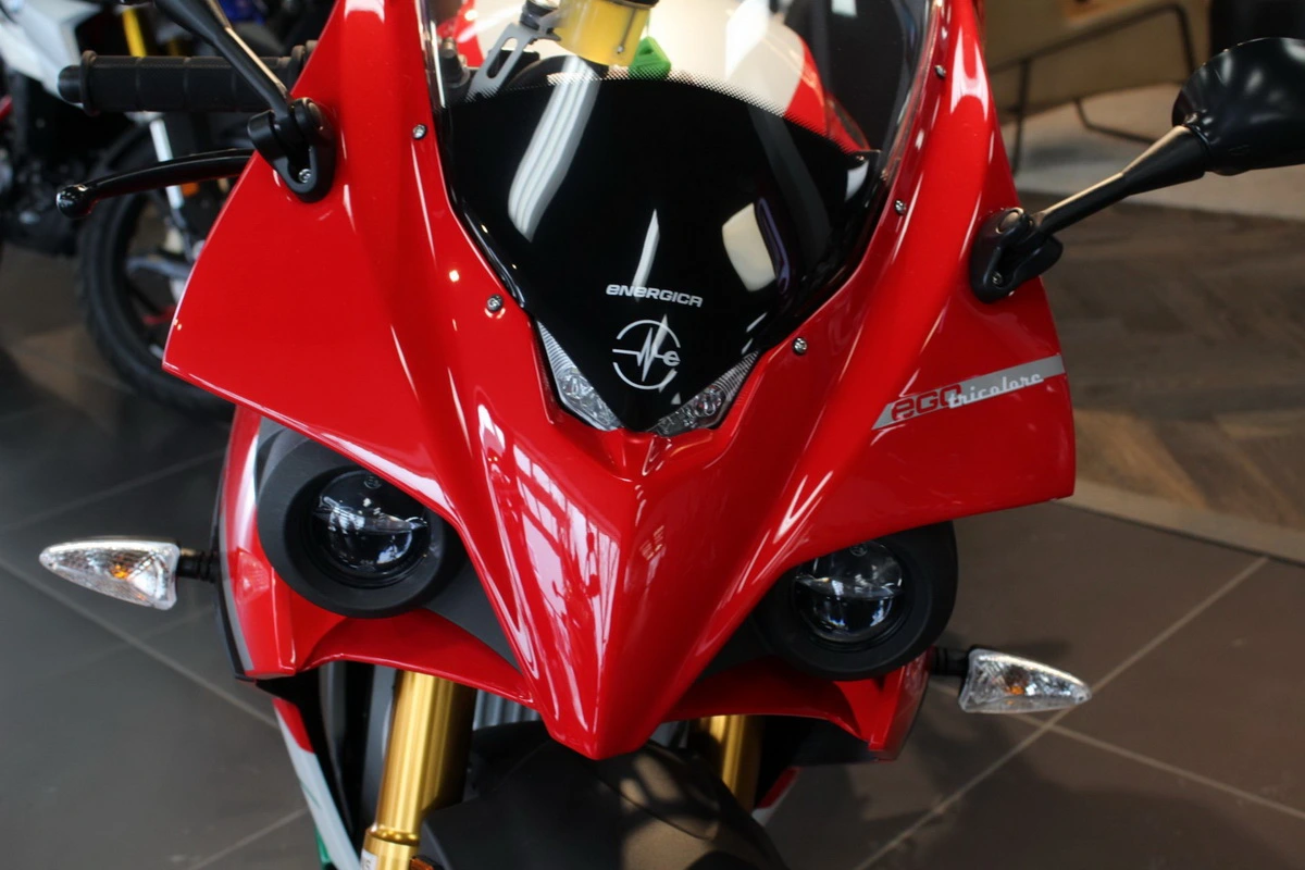 Energica's bodywork is among the best in the world, designed more for performance than aesthetics, because, ultimately, form must follow function. Like its internal combustion engine equivalents, the aerodynamic advantages start right at the front with a moulded front wing that acts as a spoiler to expel the air that comes in to cool the engine. The actual fairing has a pair of headlights mounted in recesses in the front fairing with a bubble screen at the top that cuts through the wind for the rider, although you'll have to rest your chin on the tank to take advantage of it.