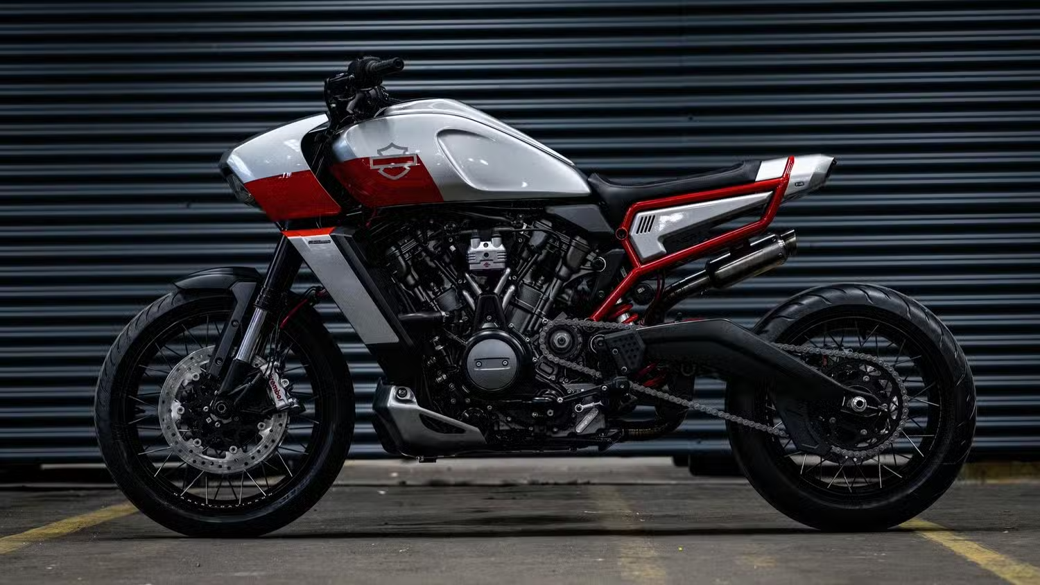 Powerbrick kept the Harley-Davidson aluminium modular frame, which is already quite sturdy and lightweight. However, for the sake of visual purity and more radical geometry, they completely redesigned the rear end. The rear subframe is now shorter, with a redesigned flat tracker-style seat that gives the bike a more compact, aggressive profile.