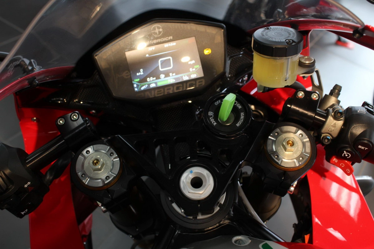 Energica's bodywork is among the best in the world, designed more for performance than aesthetics, because, ultimately, form must follow function. Like its internal combustion engine equivalents, the aerodynamic advantages start right at the front with a moulded front wing that acts as a spoiler to expel the air that comes in to cool the engine. The actual fairing has a pair of headlights mounted in recesses in the front fairing with a bubble screen at the top that cuts through the wind for the rider, although you'll have to rest your chin on the tank to take advantage of it.